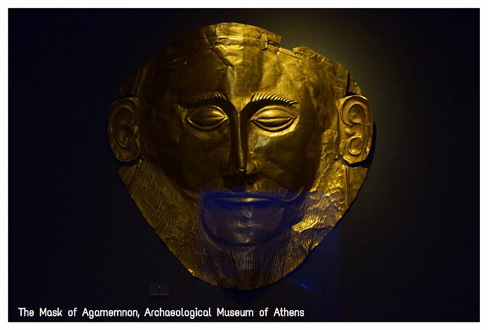 Золотая погребальная маска XVI в. до н.э., найденная Генрихом Шлиманом в микенской шахтовой гробнице (1876). Один из самых известных артефактов бронзового века. Тонкая работа по золоту демонстрирует высочайший уровень микенского ювелирного искусства и портретного мастерства.